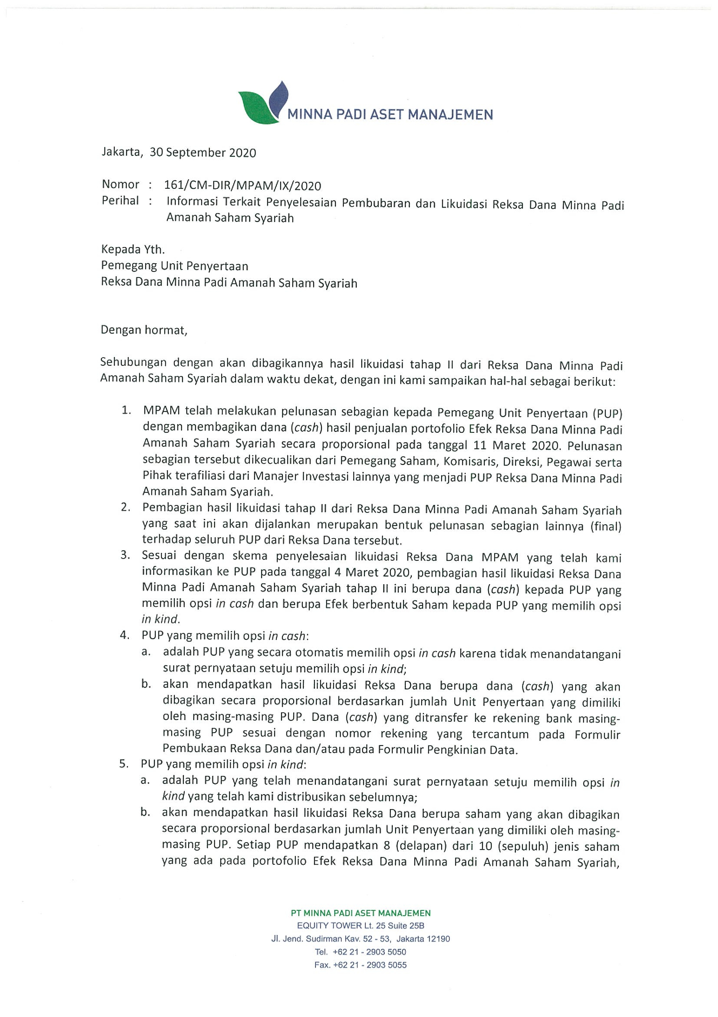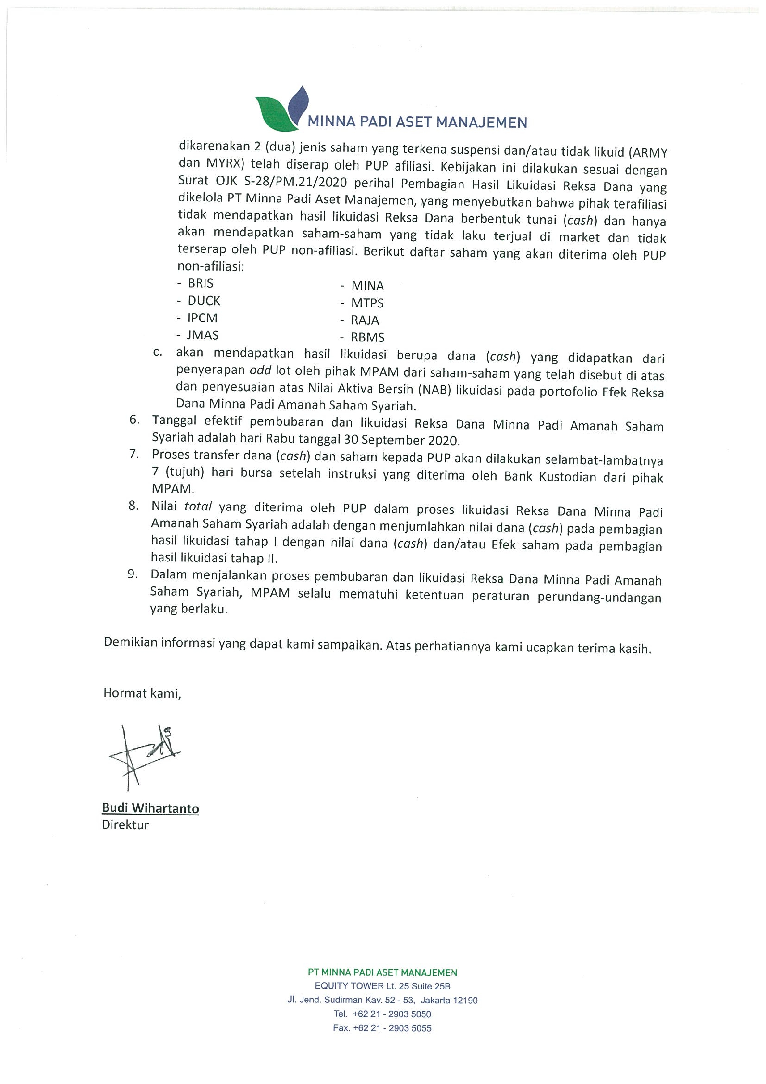 Pengumuman Penyelesaian Likuidasi Reksa Dana Minna Padi Amanah Saham Syariah